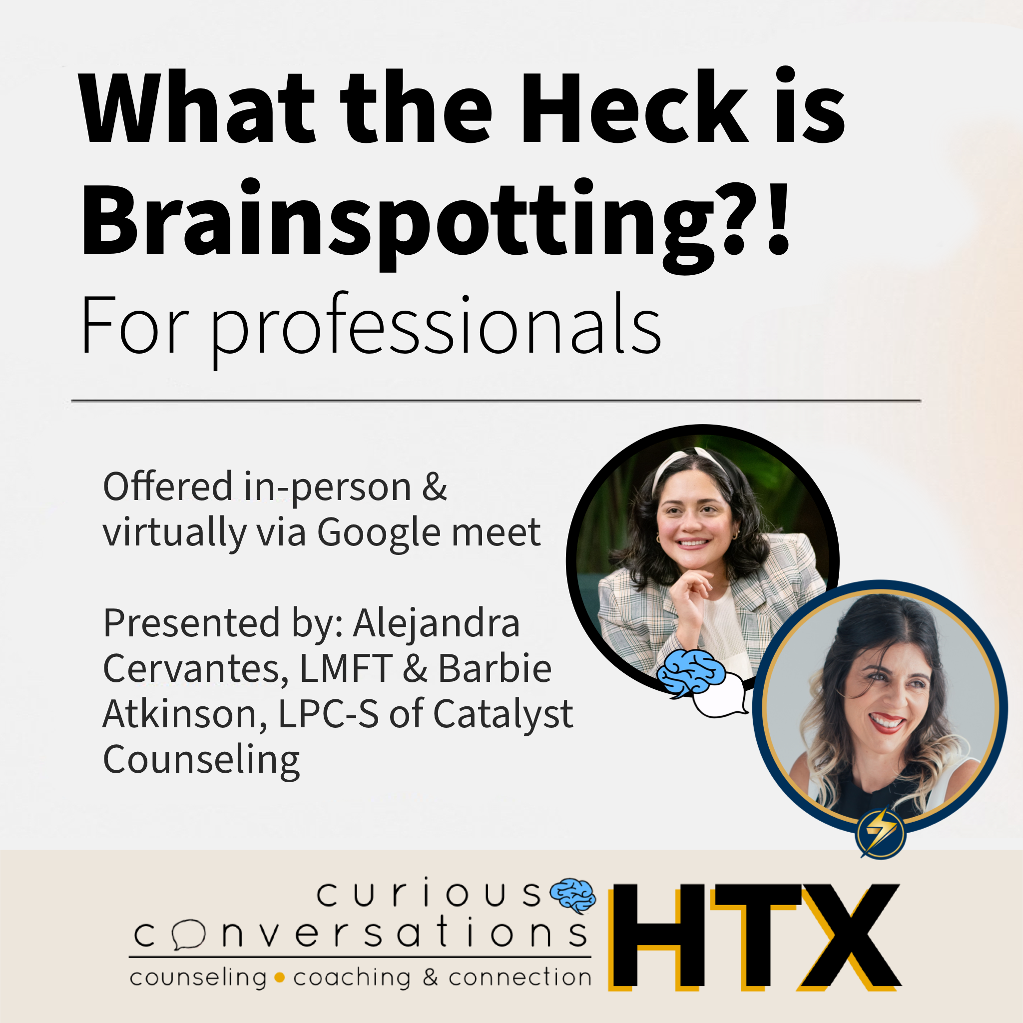Join two certified Brainspotting practitioners, Alejandra Cervantes, LMFT & Barbie Atkinson, LPC-S, for a presentation for professionals that will give you a basic overview of what the heck Brainspotting is, what you can use it for, how it can help your clients, AND observe a live demonstration of an actual Brainspotting session led by one of our experts with an audience volunteer.
